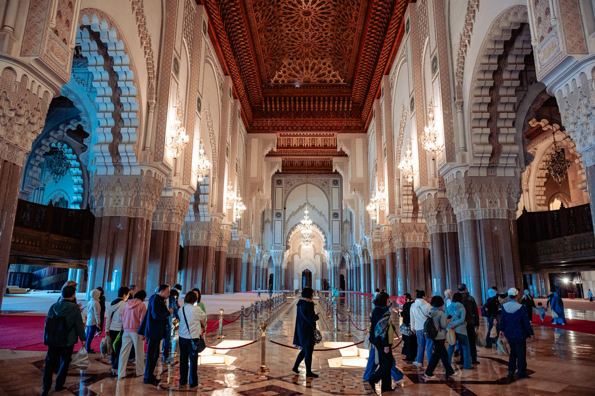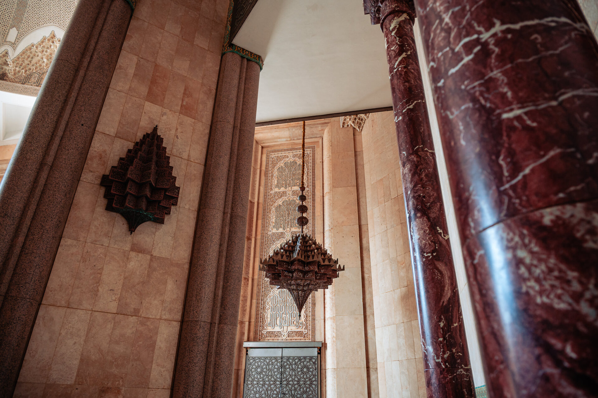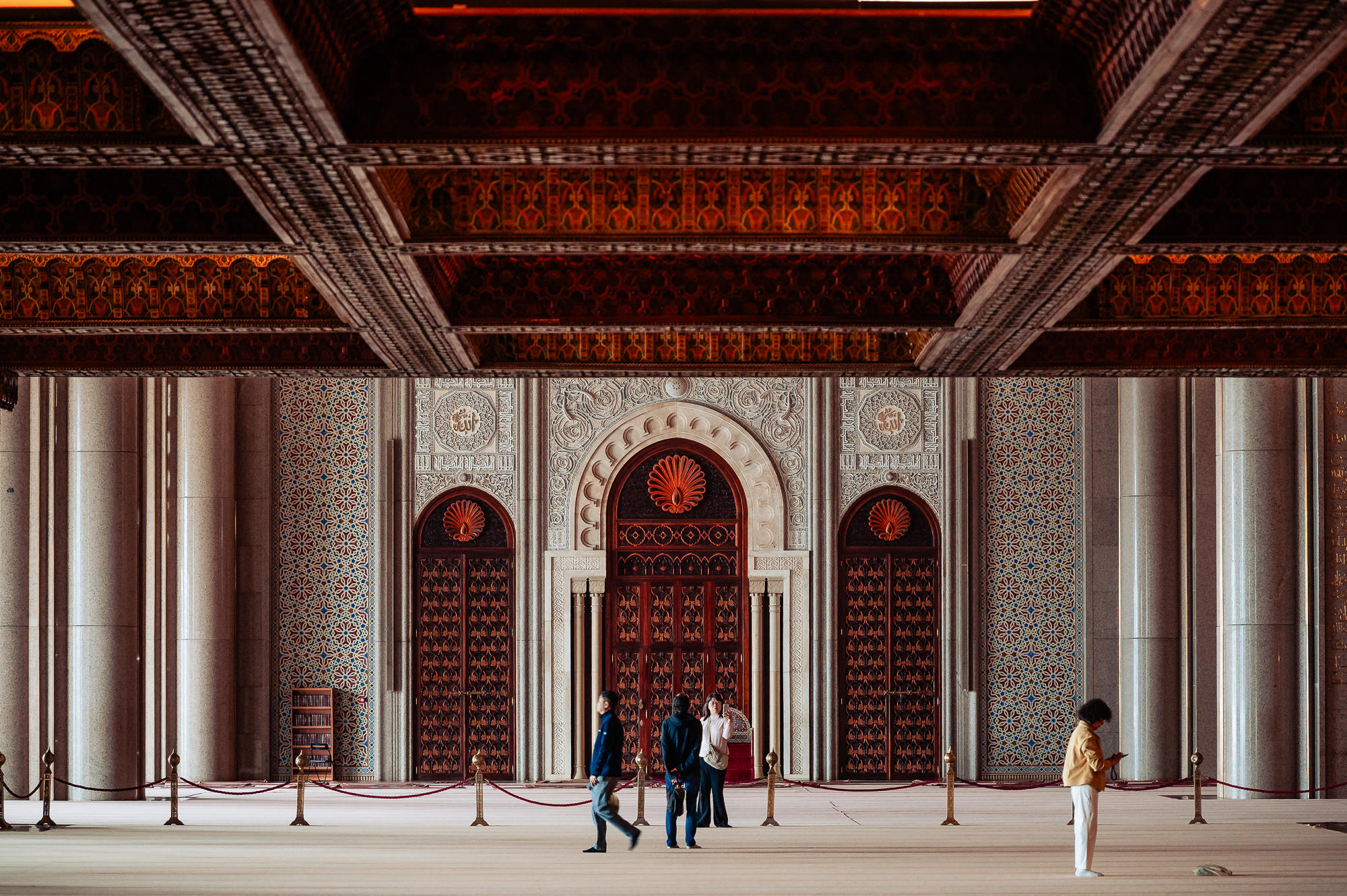 Perched on the edge of the Atlantic Ocean, the mosque stands on a promontory of reclaimed land. It is one of the largest mosques in the world, with a minaret that reaches 210 meters into the skies of Casablanca, making it the tallest religious structure on Earth. However, statistics alone cannot convey the experience of standing before it. The sheer scale of the building is almost beyond comprehension, yet it is crafted with extraordinary delicacy. Every surface is alive with hand-carved plaster, intricately laid zellige tilework, and exceptional cedarwood craftsmanship, which together prevent it from feeling overwhelming. Instead, it feels like a declaration of love. I’ll have the honor of photographing the wedding portraits of my son and his fiancé here the day before the wedding.