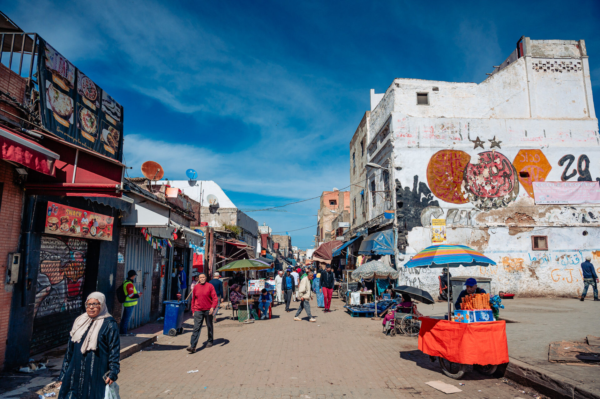 Large murals adorn the facades of buildings throughout the district, showcasing powerful and sophisticated artistry that reflects Moroccan identity, global culture, and the vibrant creative energy of a young, confident city discovering its voice. As a photographer, I thrived in this environment; the scale of the artworks, the quality of the imagery, and the interaction between street art and the surrounding urban landscape produced some of the most visually dynamic photography of my entire trip.