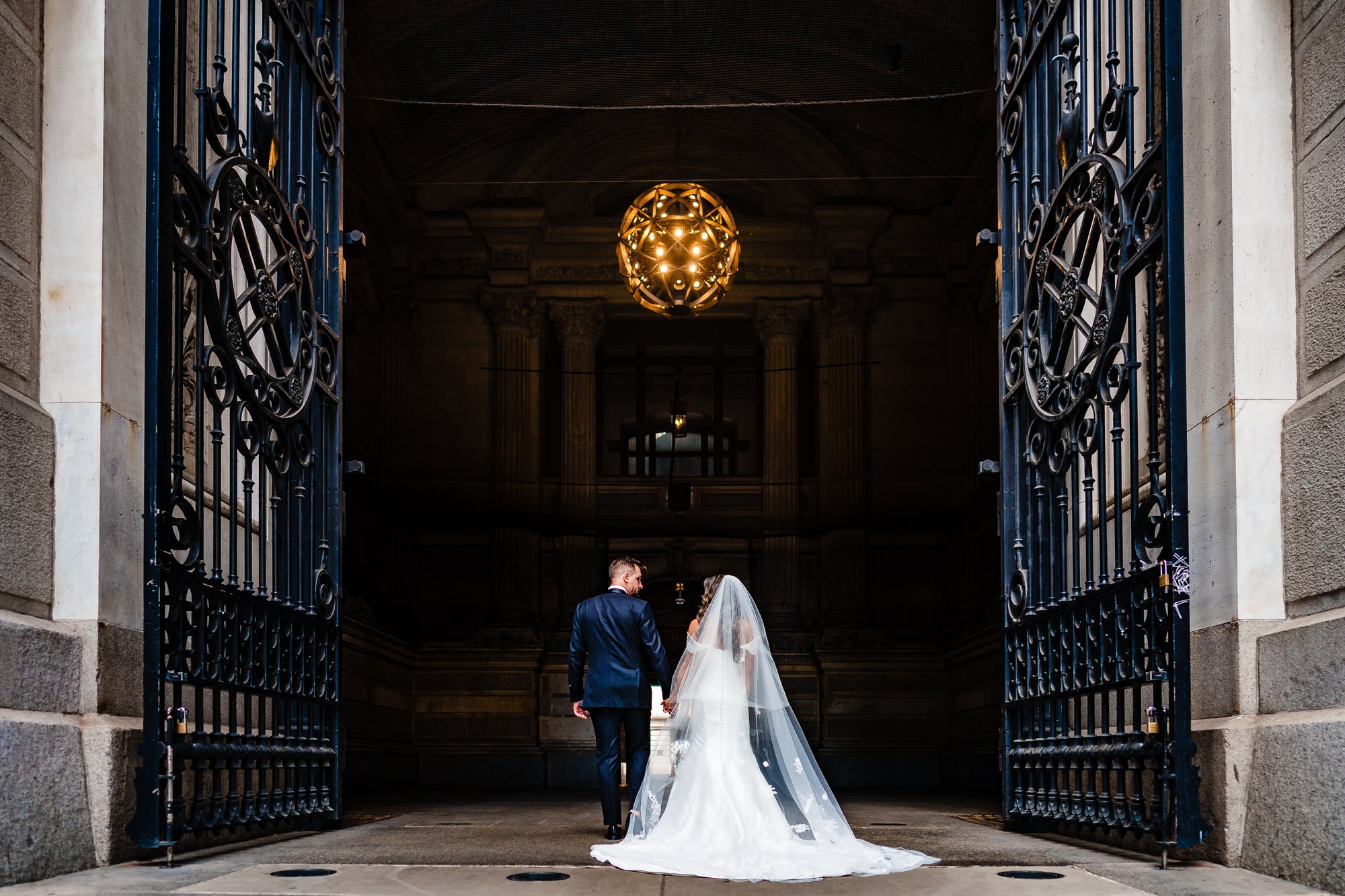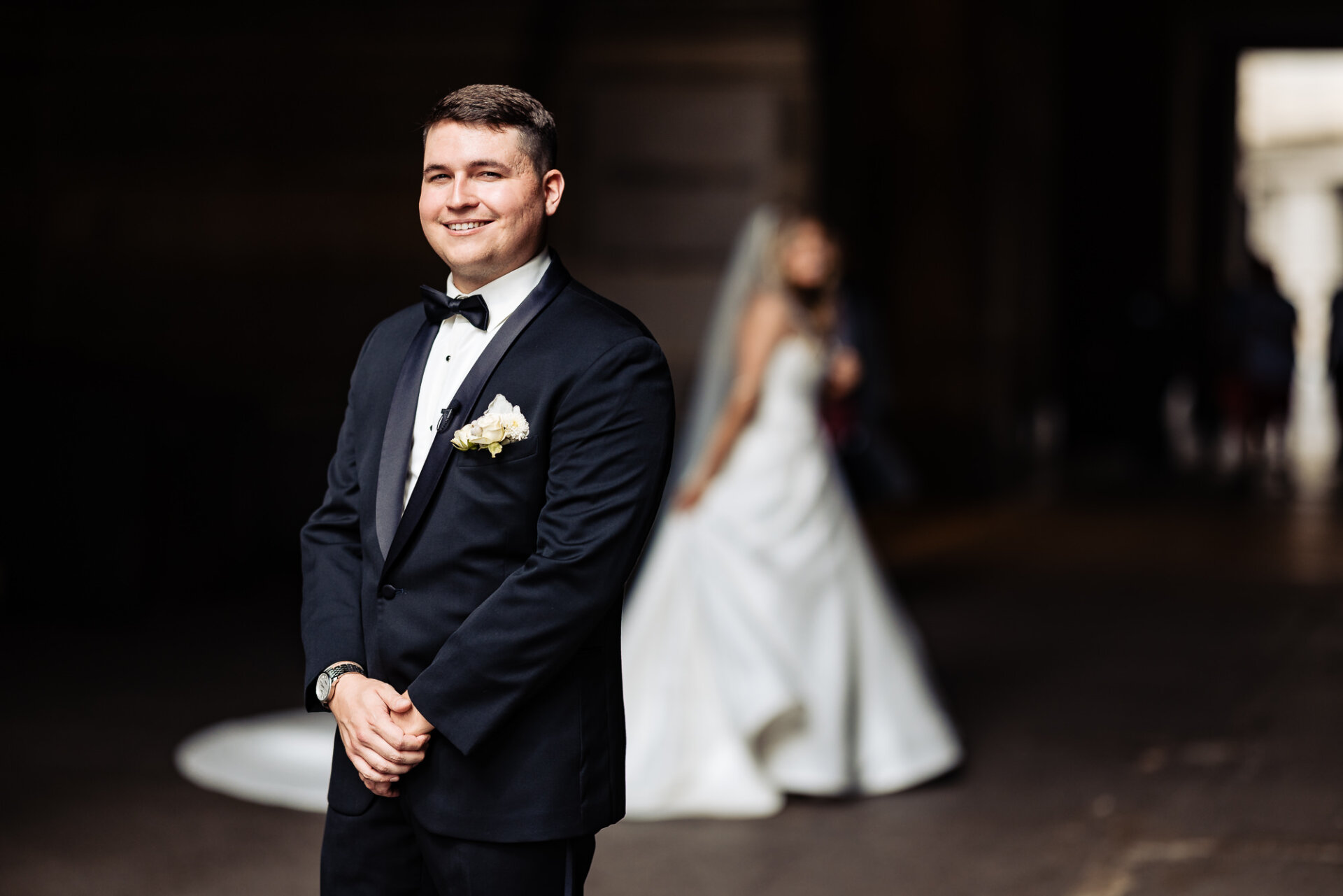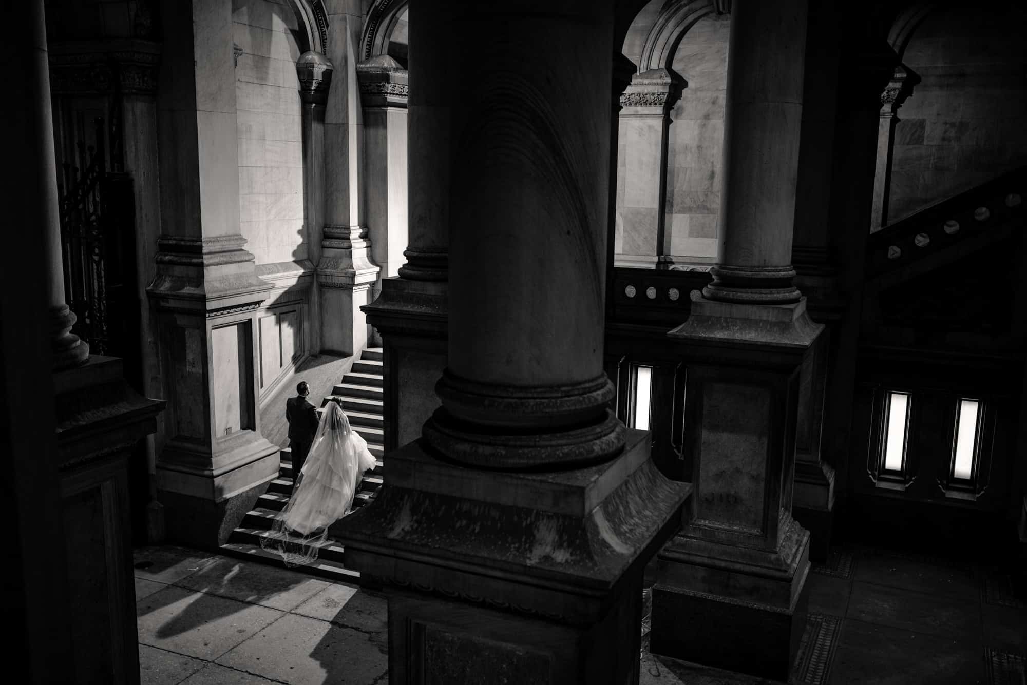 We’ll use this City Hall session as a warm-up: you’ll walk, pose, move naturally in front of the camera, and explore city frames and architectural textures. By the time your wedding day arrives, we’ll already know your best angles, how you interact together, and how to leverage urban vs indoor backdrops so your wedding coverage will run smoothly and feel more relaxed.