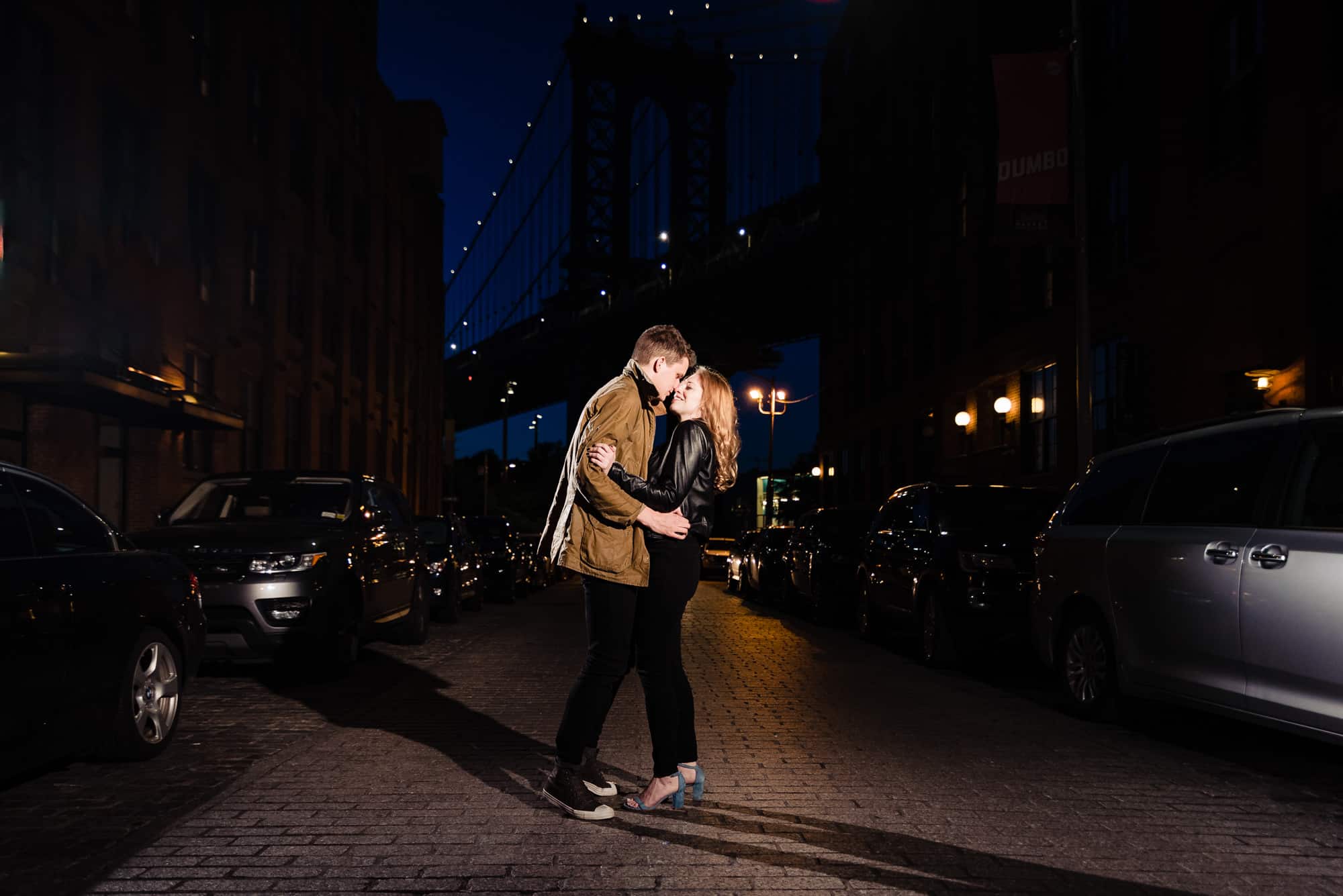 Unfortunately, they hit a ton of traffic on the way to Brooklyn and were about 45 minutes late for their DUMBO e-session. When a couple is late for their session, they are stressed out upon arrival 100% of the time. Knowing this, I like to reassure them that we have plenty of time and to just try and shrug it off, put it behind them and have some fun.