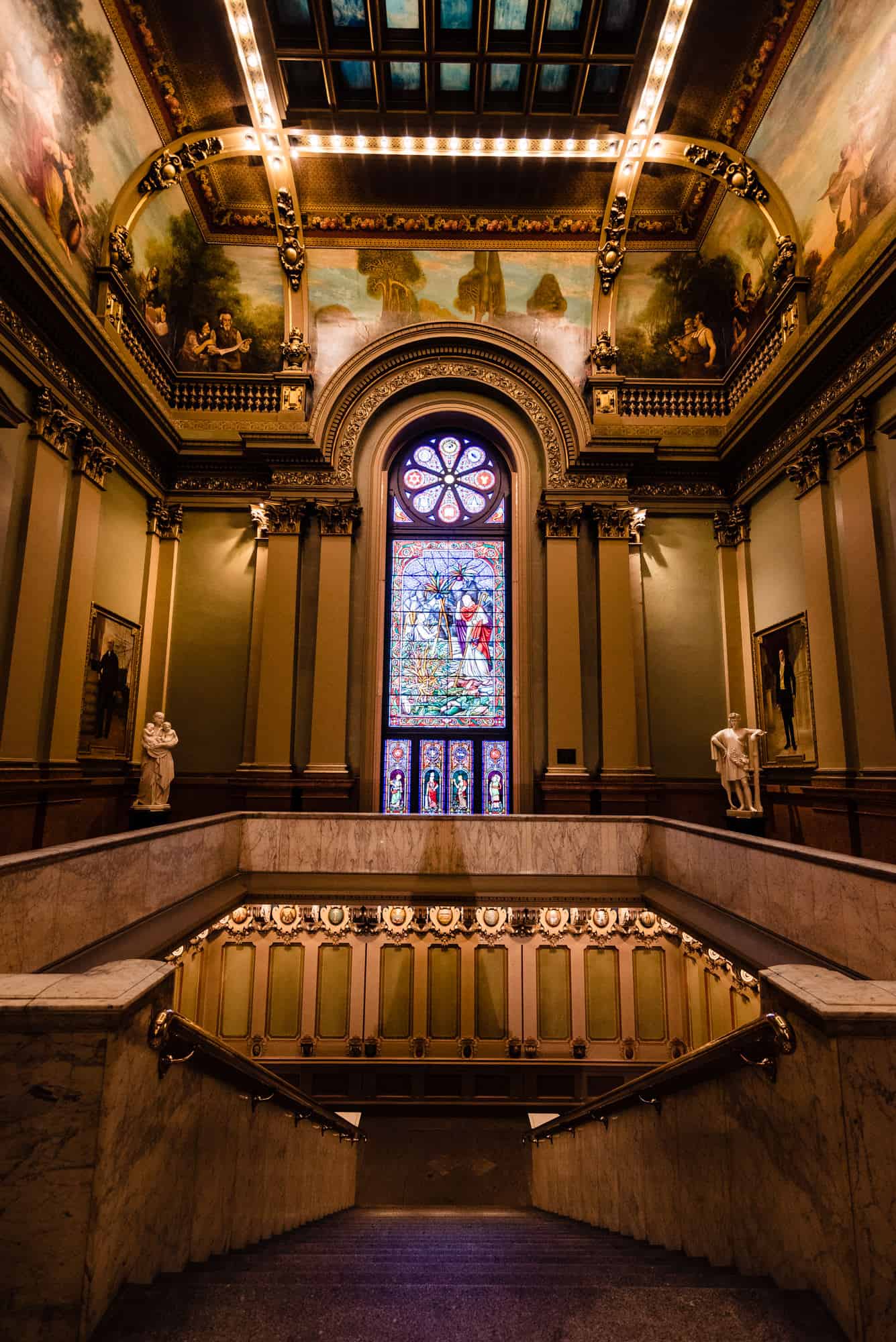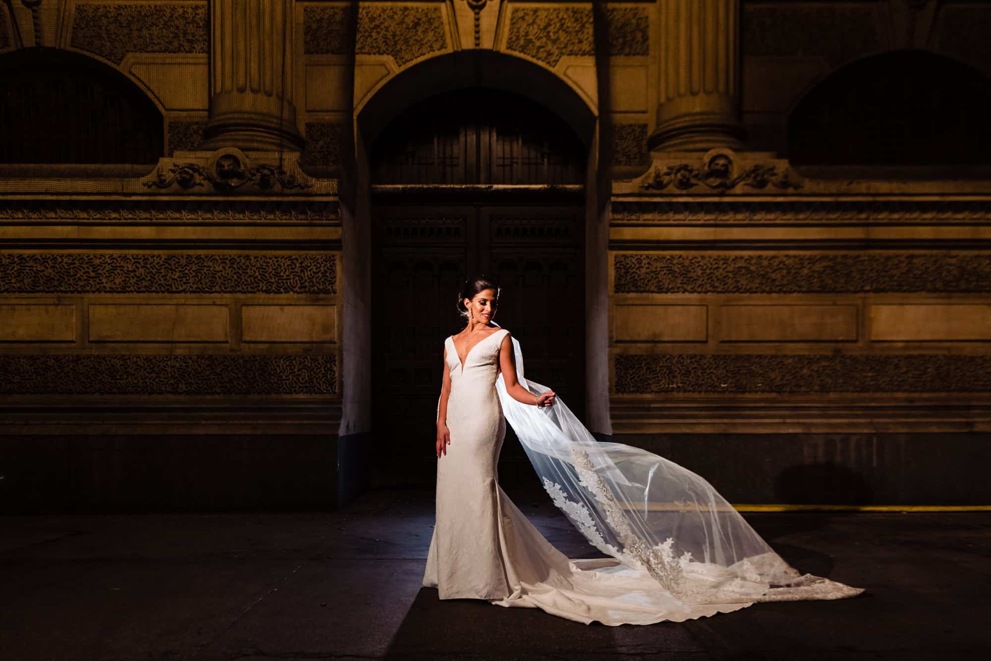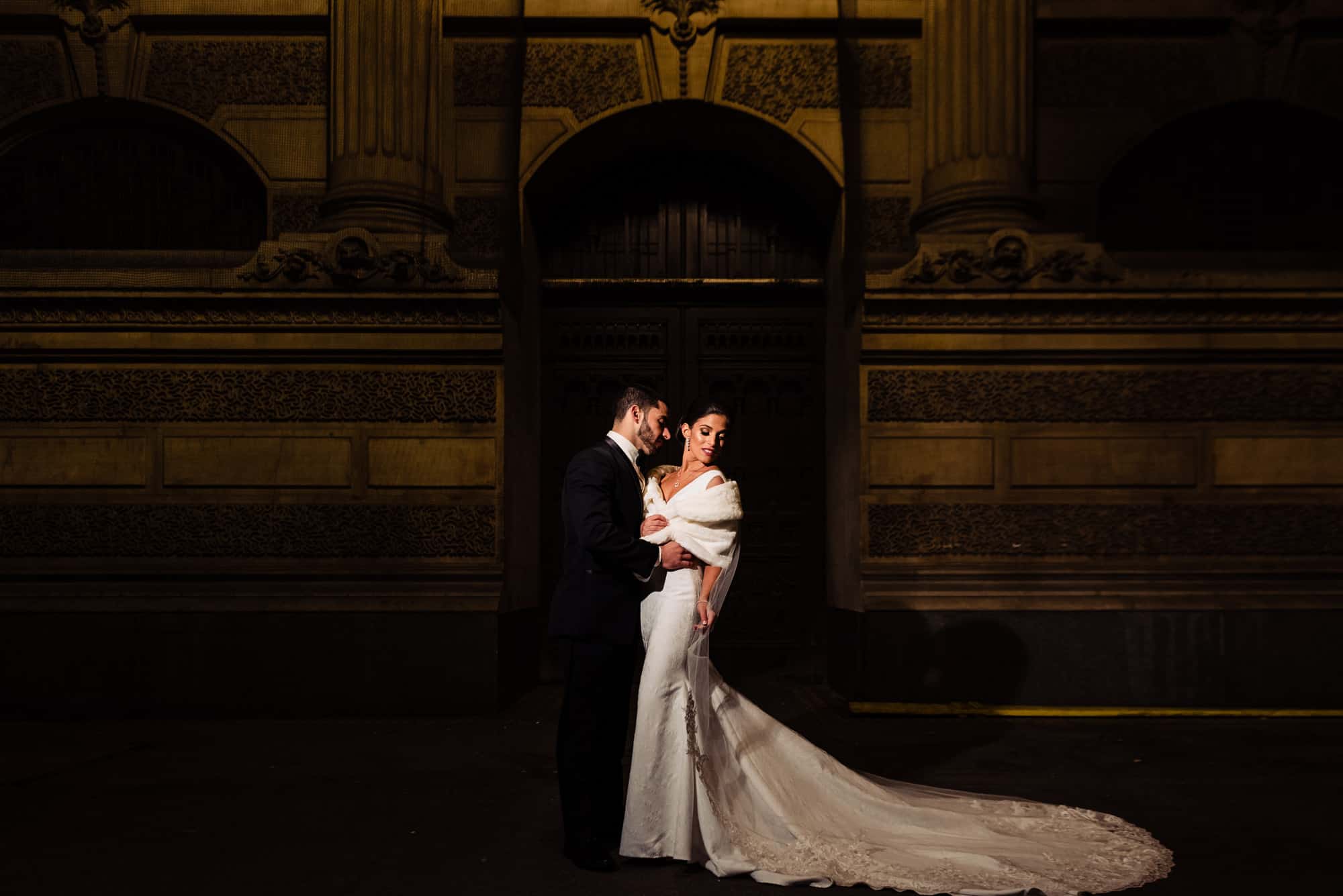Beautiful portrait of bride and groom on the stairs of the Masonic Temple of Philadelphia.