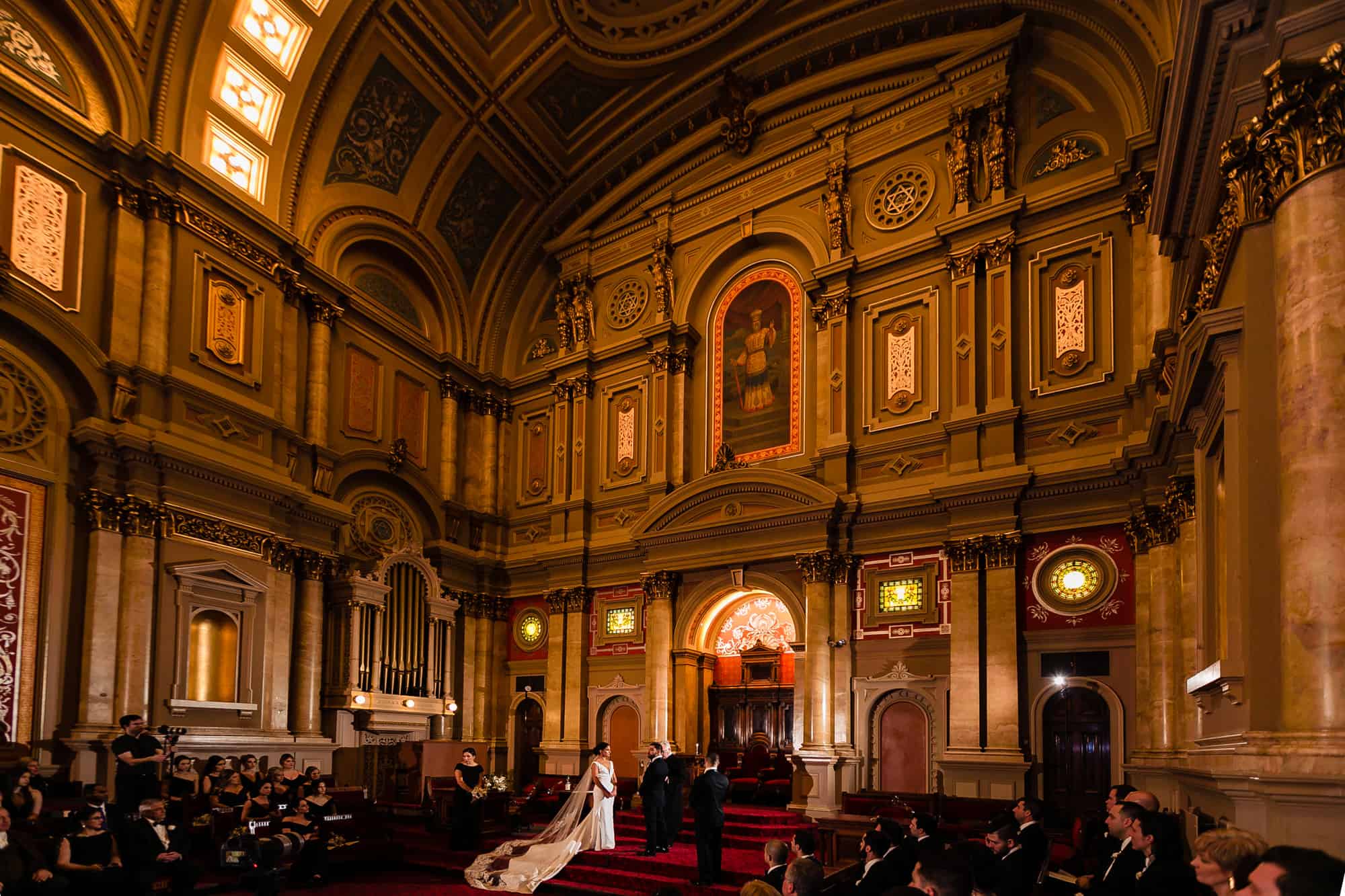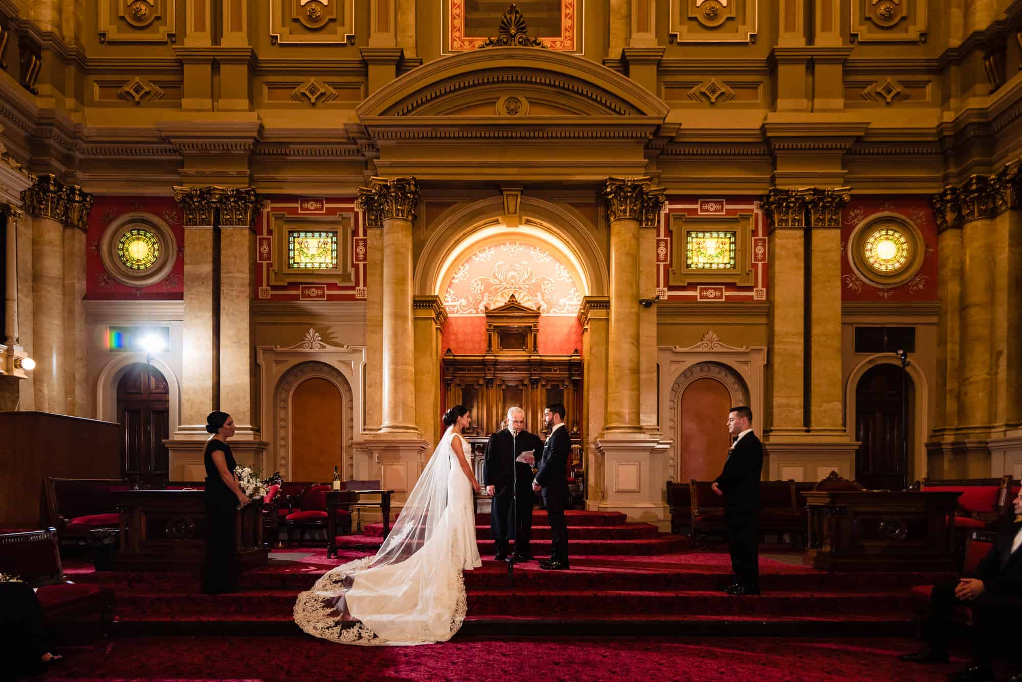 If you want to feel like a princess while walking down the aisle, look no further than having a Masonic Temple of Philadelphia wedding ceremony followed by a reception at the Crystal Tea Room. Santina and Bobby held their ceremony in Renaissance Hall, which was constructed in 1891. This brilliant scarlet red room is decorated in the Italian Renaissance style and has a very opulent, old-world feel about it. I loved the contrast of the red tones in the room against Santina’s white dress!
