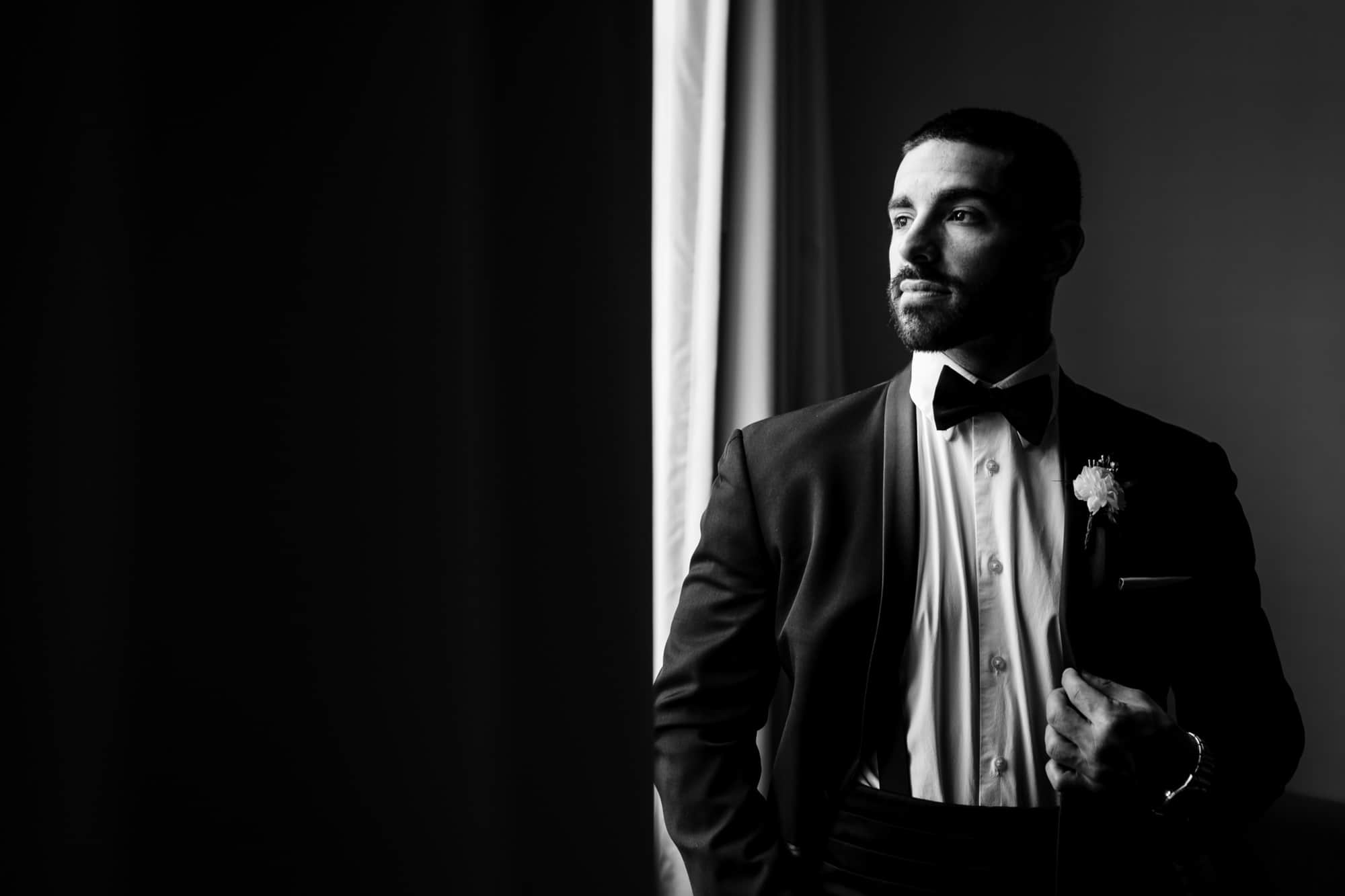 Portrait of groom with his hand in one pocket on stairs at the Masonic Temple of Philadelphia