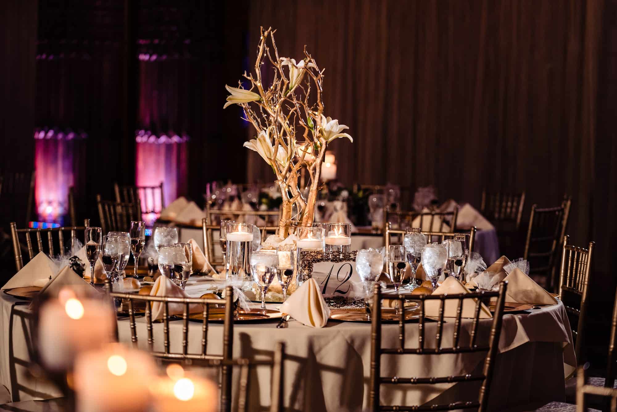 Beautiful golden tree branch centerpiece by Carl Alan Floral at the Crystal Tea Room
