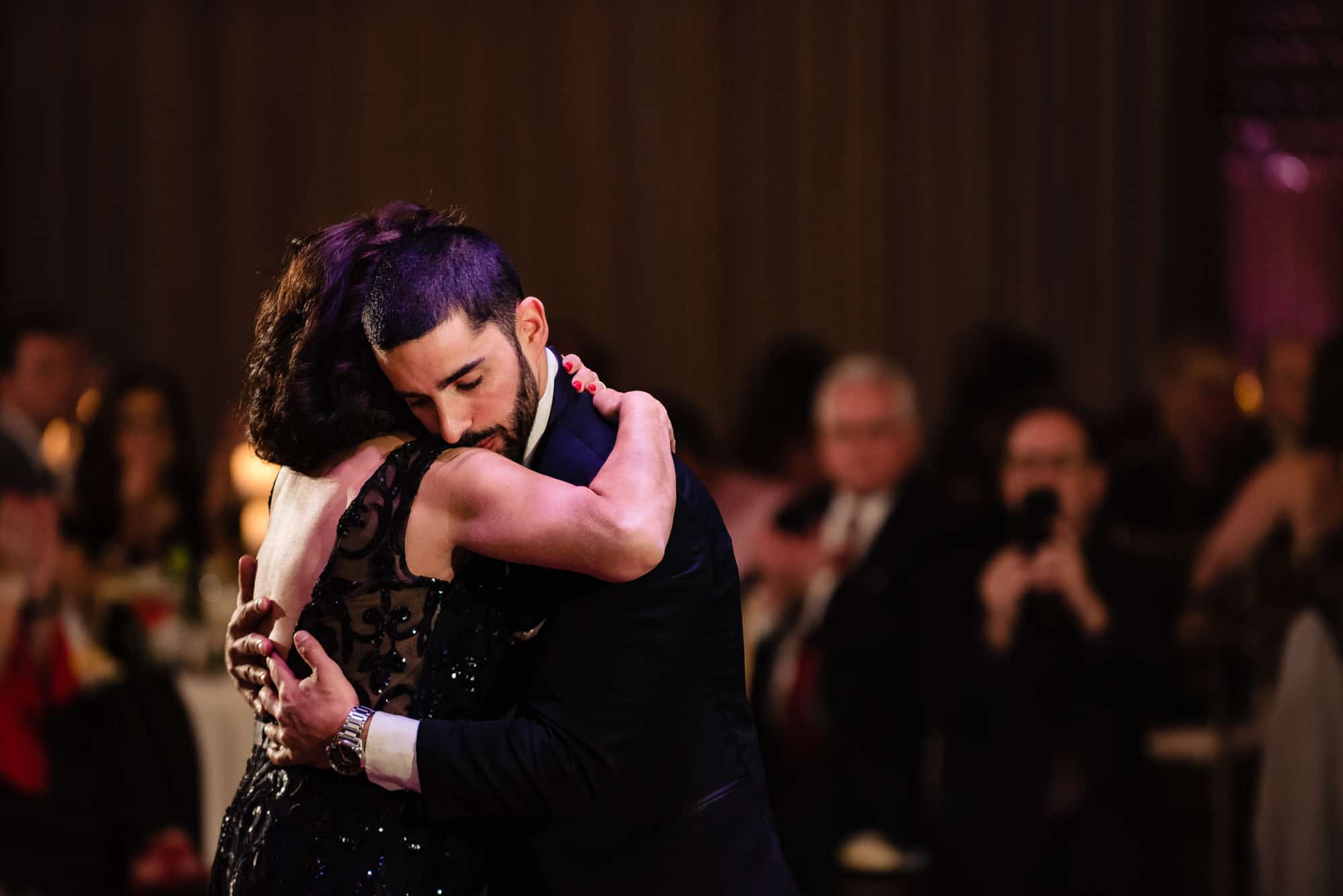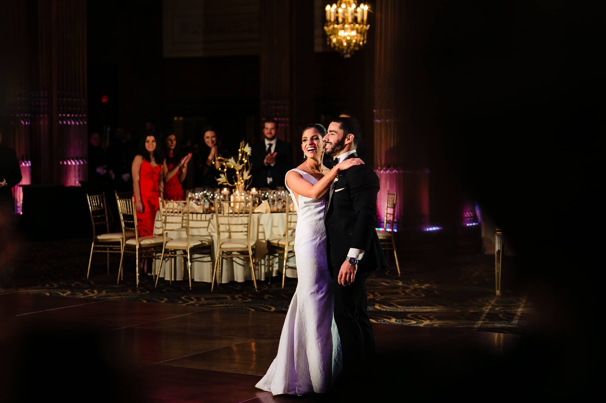 Wide shot of bride and groom first dance at the Crystal tea Room