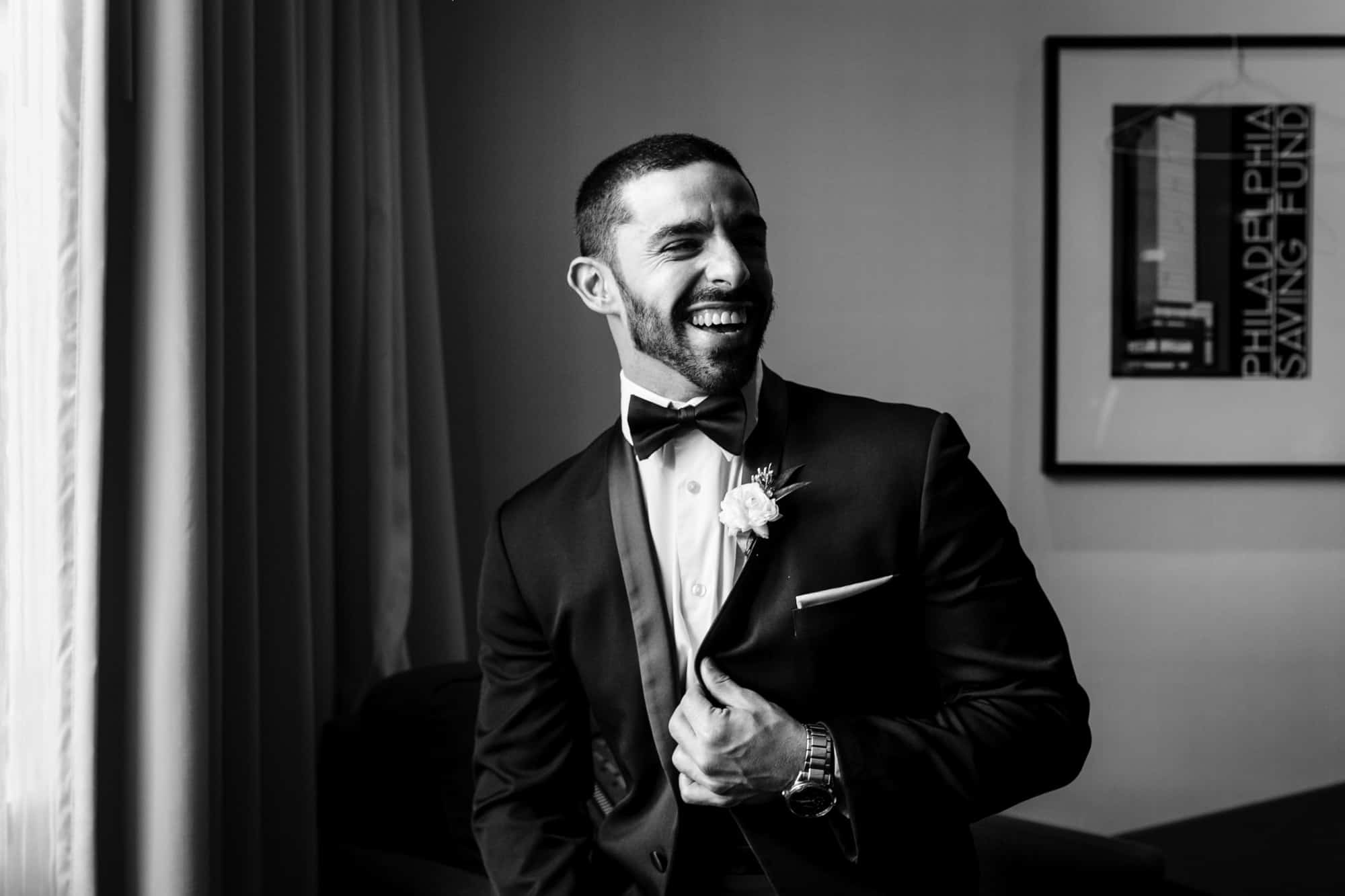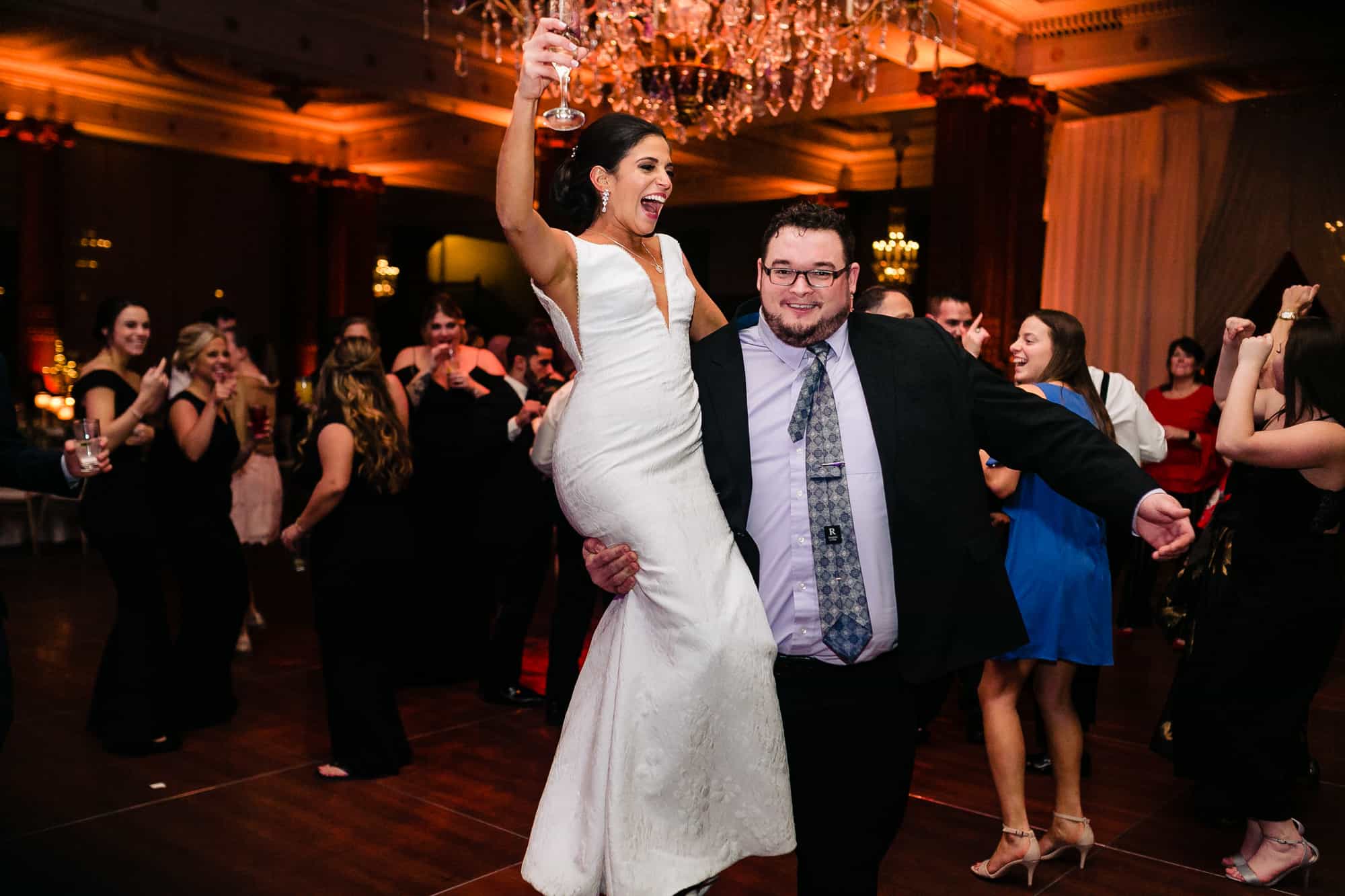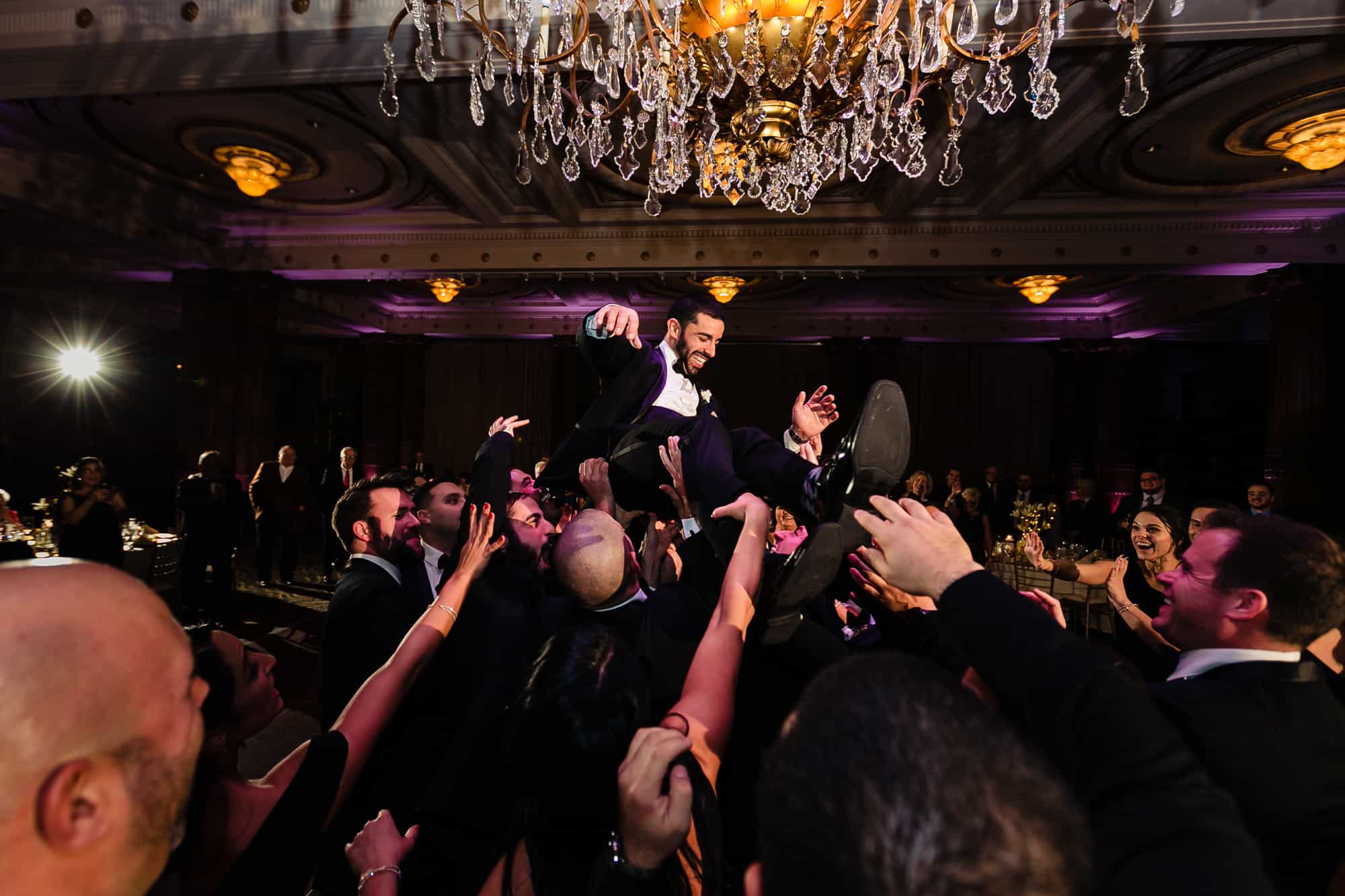 Groom laughing while being raised up by a crowd of guests at the Crystal Tea Room in Philadelphia.