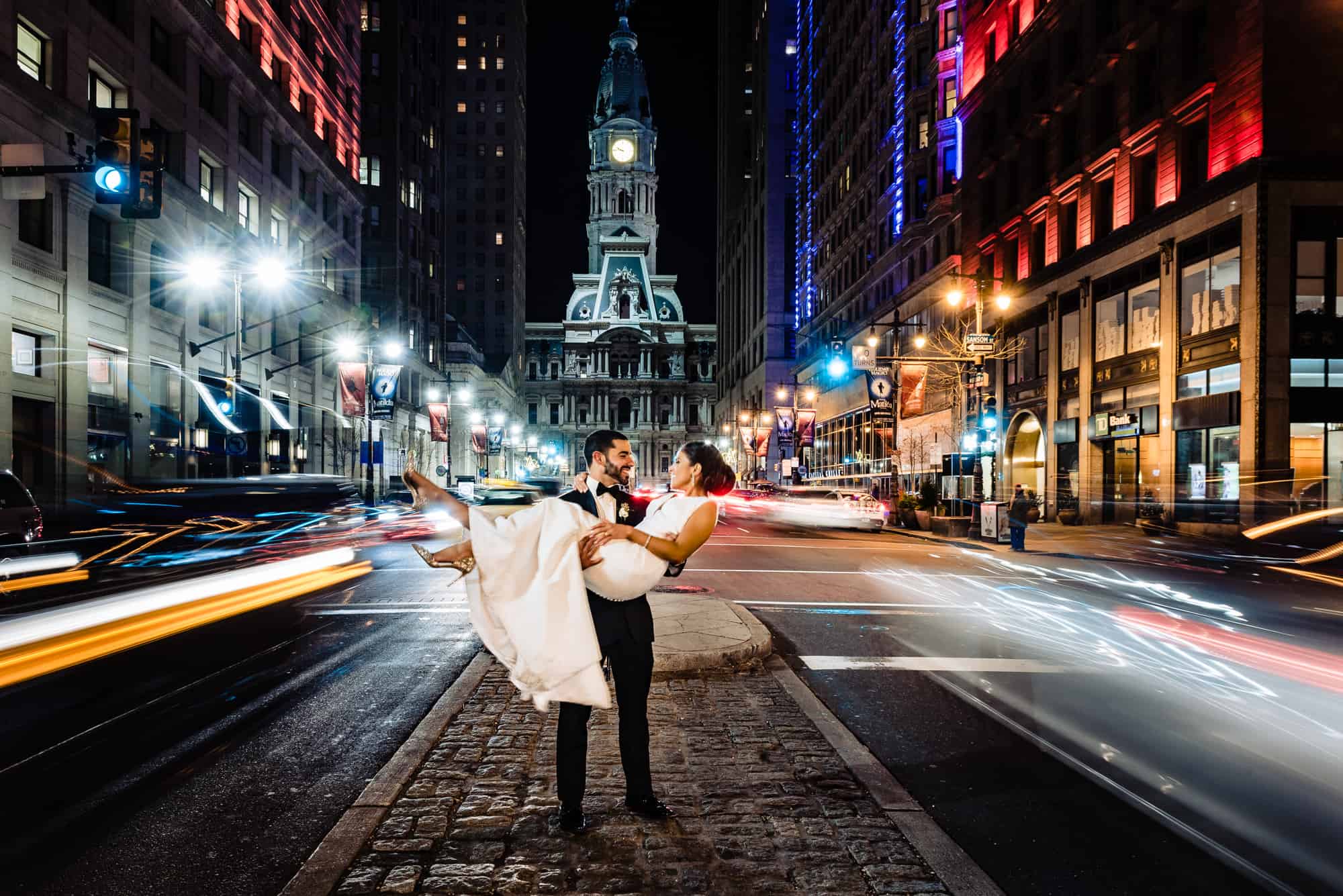 Image shot from behind of bride and groom walking in Center City Philadelphia. Groom is holding