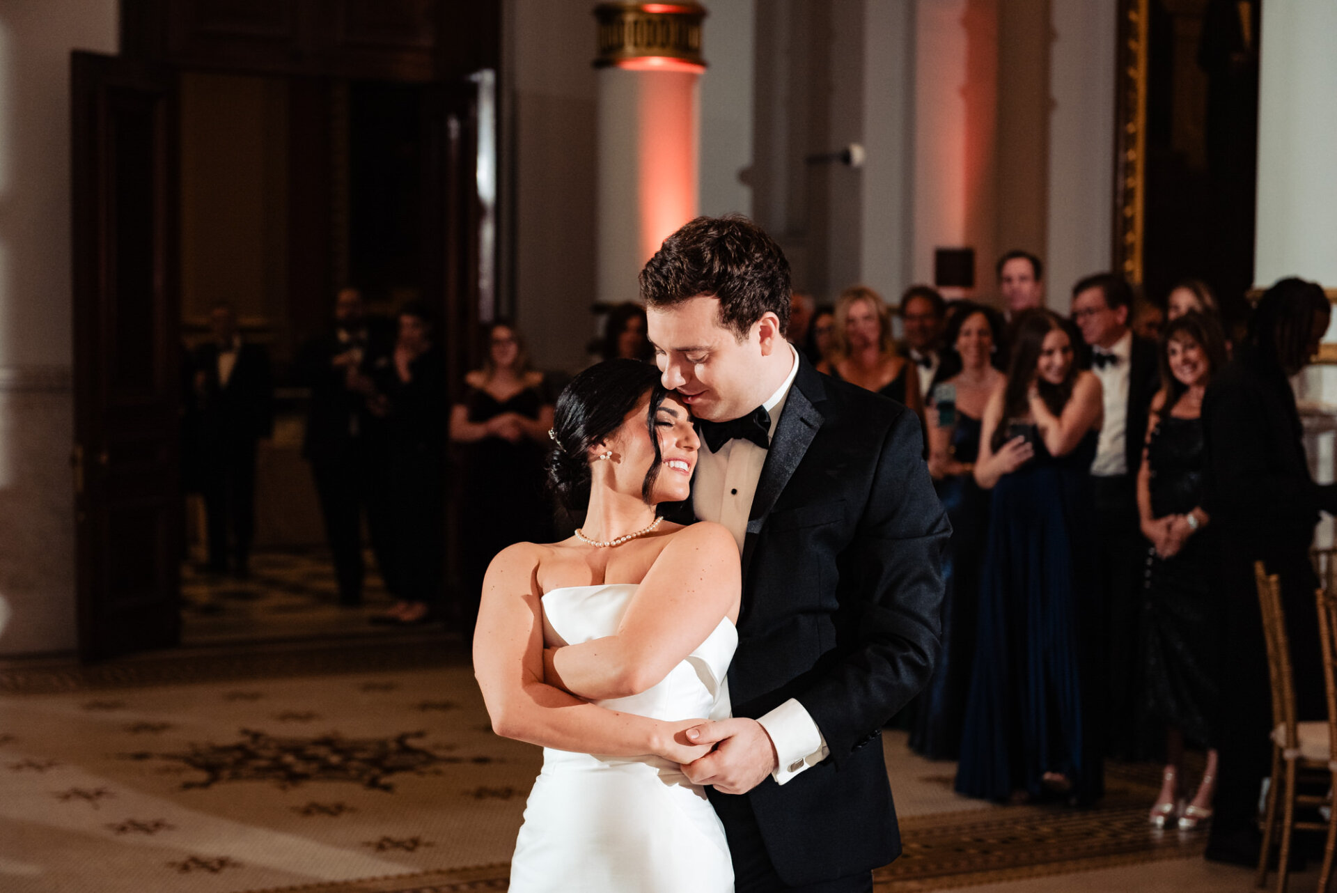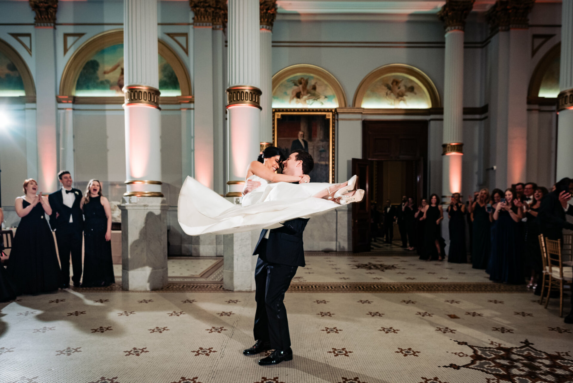 The Grand Ballroom handles up to 200 seated guests for dinner and up to 450 for receptions – ideal for couples who want an elegant celebration with room to move. The natural light, ornate ceilings, and centerpiece Benjamin Franklin statue offer striking focal points without overpowering the couple in the frame. The Grand Foyer, with its marble floors and dramatic staircases, sets the stage for pre-dinner cocktails and natural photo transitions between moments.