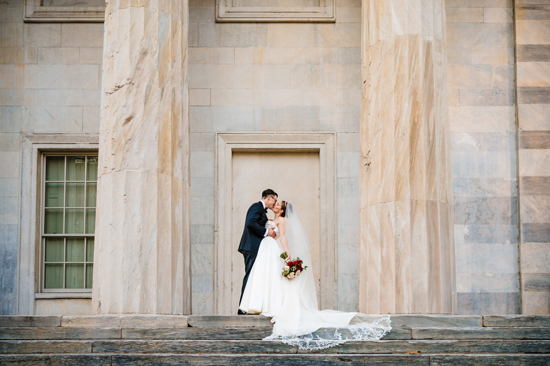 Reception:  Ballroom at the Ben | Dress:  Elegance by Roya in Virginia | Cake: Master’s Baker | Music: Ryan O’Connell | Hair: Top Knots by Aimee   | Make-up: JKO Beauty | Florist: Beautiful Blooms | Videographer: Flower & Oak