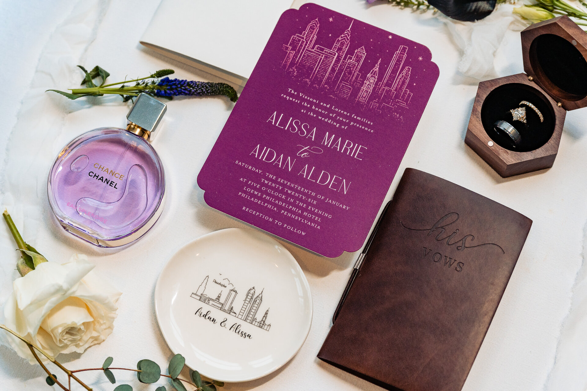 For five years, they navigated 800 miles of distance with 12-hour car rides, FaceTime dinner dates, and weekends split between Philly and Music City. In May 2024, the distance finally closed when Aidan moved back to Philadelphia. They moved in together, and soon after, he led Alissa on a sunset walk toward the Philadelphia Museum of Art, where he proposed in a quiet garden near the top of the steps.